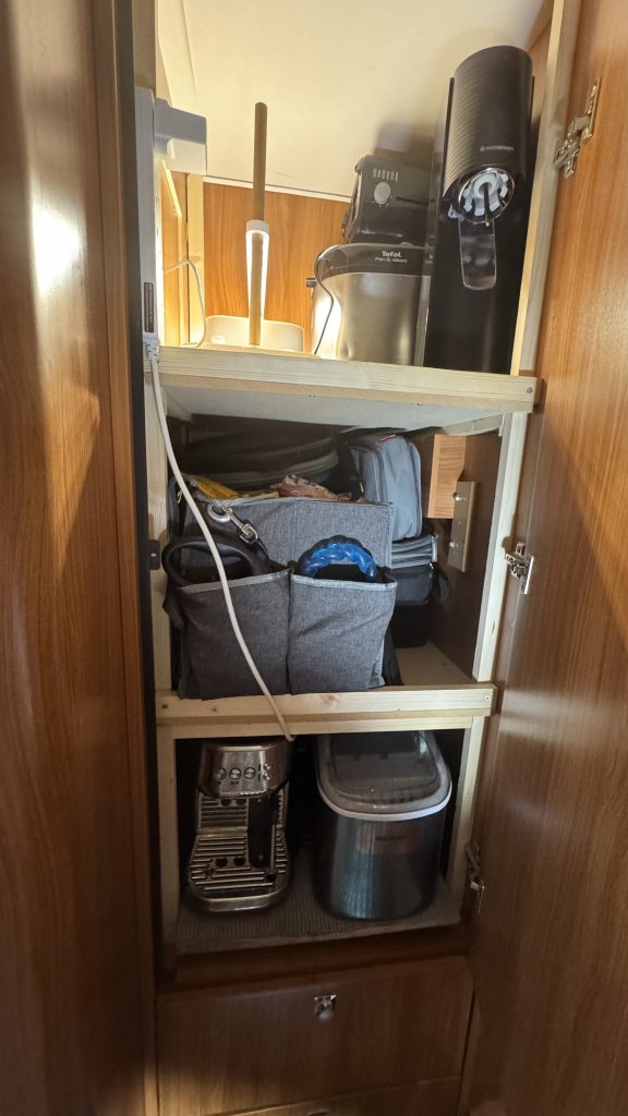 We’re not short on culinary kit. A wardrobe was converted into a custom home for the Sage Bambino Pro coffee machine and an ice maker — both on slide-out shelves. Add an Instant Pot Duo, an electric skillet, and the three-ring gas hob, and we can cook almost anything.