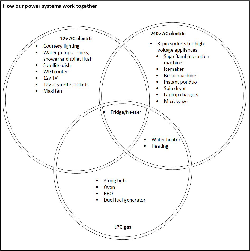 - Flexibility — wherever we site the van, whatever the hookup situation, whatever the weather.